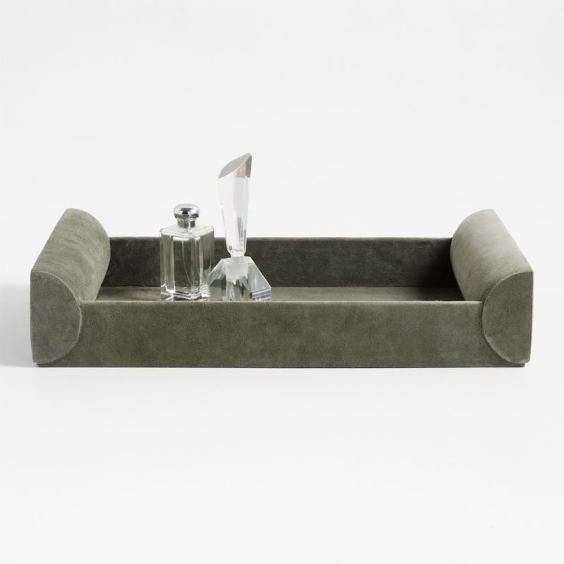 A glam way to unify your most eclectic groupings, the Ruff tray dresses up your coffee table, entryway console or dresser with luxe green suede. The muted green leather softens the tray's crisp lines and bold curves. We especially love using this catchall in the bedroom to corral a scent collection or to hold all jewelry and accessories tossed off at the end of the day.