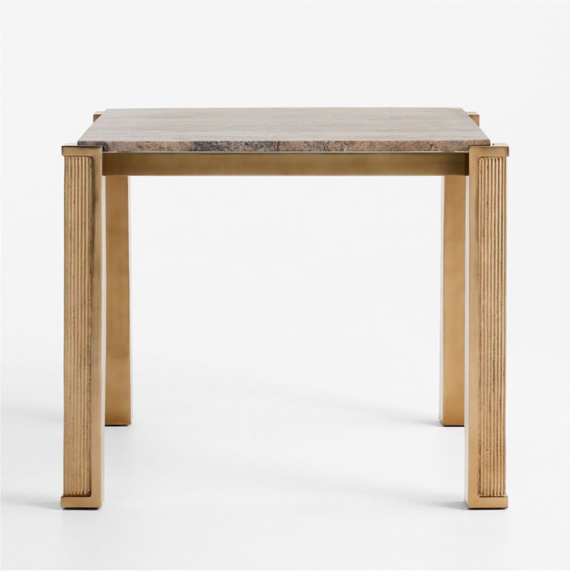 Rummer seamlessly blends classic and contemporary design in a versatile table equally at home in the kitchen, foyer, living room or library. Ribbed detailing on the cast aluminum legs nods to linear Art Deco style, finished in burnished brass and polished to a high luster. A slab of honed silver travertine stone forms the top, exhibiting natural variation and texture unique to each piece.