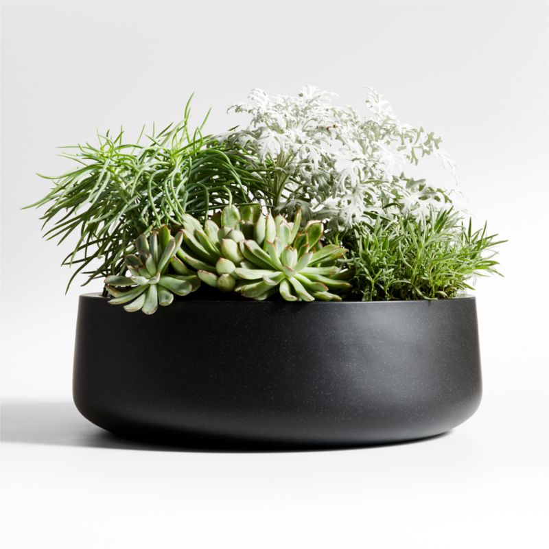 Plants really pop in our gracefully curved Saabira planter. The low, wide tabletop planter in subtly flecked black lends a contemporary look to layered container plantings or houseplants. Made of a durable mix of resin, fiberglass and stone, our exclusive Saabira planter is designed to live indoors or out.