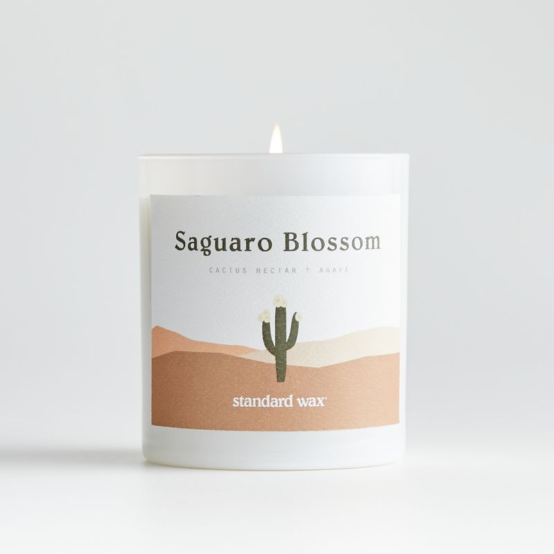 Create a serene scene inspired by the stark simplicity of the desert landscape with our arrangement of candles and objets d'art in black and white. Elevating black taper candles, our concrete Lorin candle holders go light and airy in a quartet of looped Lorin candle holders with a sculptural presence. Natural rattan weaves our Brigton lantern with a modern tropical vibe, handwoven by skilled artisans around a black iron frame. Decorated with round white shapes on black, our Cachuma ceramic tray has a unique ridged design that subtly elevates our tall marble brush object. Our ceramic Kinai vase plays with form and expectations, with a white reactive glaze that produces unexpected speckles. Inspired by a day in the desert, the delightful Saguaro Blossom candle fills the air with a fresh, earthy and floral aroma.