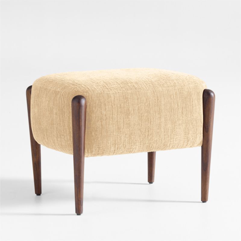 Tapered wood and soft, rounded forms add Scandinavian flavor to Santi's contemporary proportions. Turned legs of dark walnut-finished oak frame the curved contours of the substantial seat, thoughtfully cushioned to provide a supportive yet comfortably soft place to prop feet. The plush upholstery in latte brown offers the luxe feel of chenille with striated texture for an organic look. The ottoman complements the coordinating armchair.