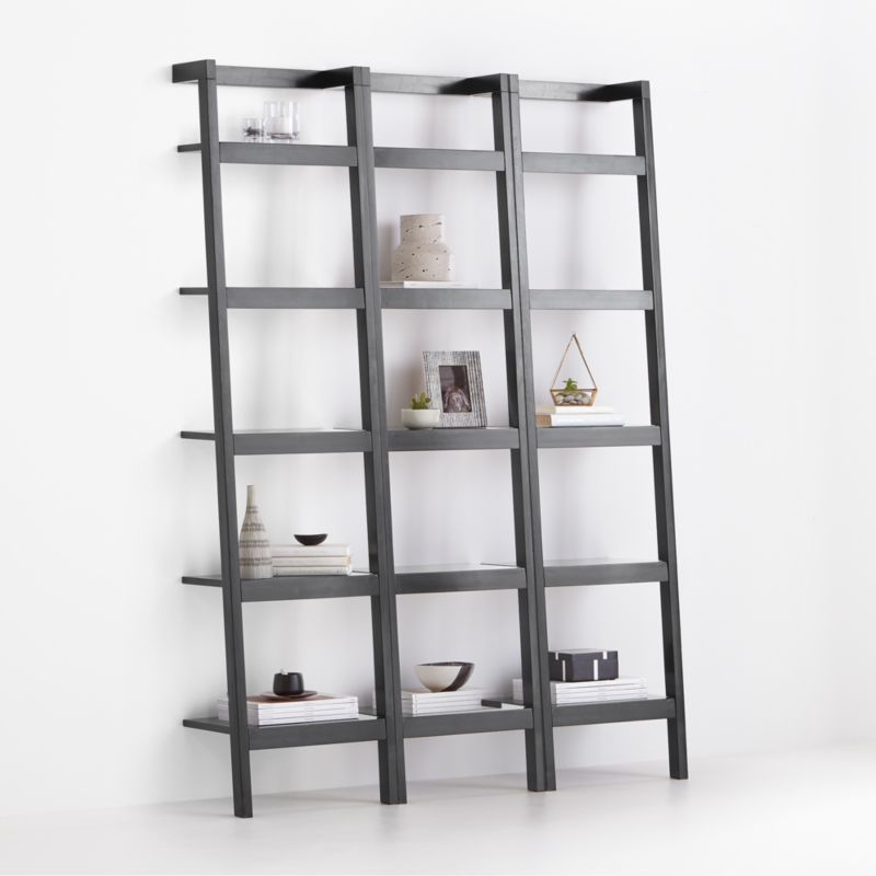 Space-saving, clean-looking Sawyer uses an ingenious leaning, modular design to creatively solve storage solutions throughout the home. This set of three solid hardwood bookcases ladders each with five deep shelves. Thick shelf fronts and a chic black finish accentuate the bookcases' architectural lines. Mix in other pieces from our exclusive Sawyer collection for a custom lineup.