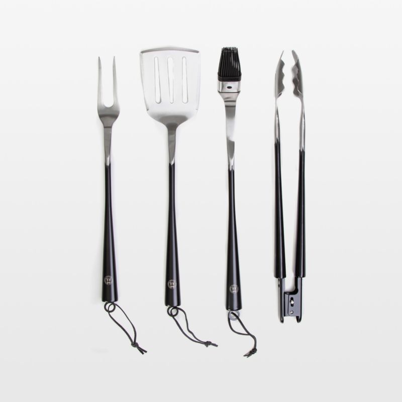 Designed for pitmasters with style, this four-piece grill set offers durability, strength and timeless good looks. Sculpted black-finished handles taper elegantly, flowing into stainless steel tool heads. Black leather hanging loops add organic beauty while keeping the utensils right at hand. Use the tongs to grab, the spatula to flip, the fork to serve and the silicone brush to baste. Presented in a handsome grey wooden box with a black leather carrying handle, this set makes a fantastic gift for the consummate griller.