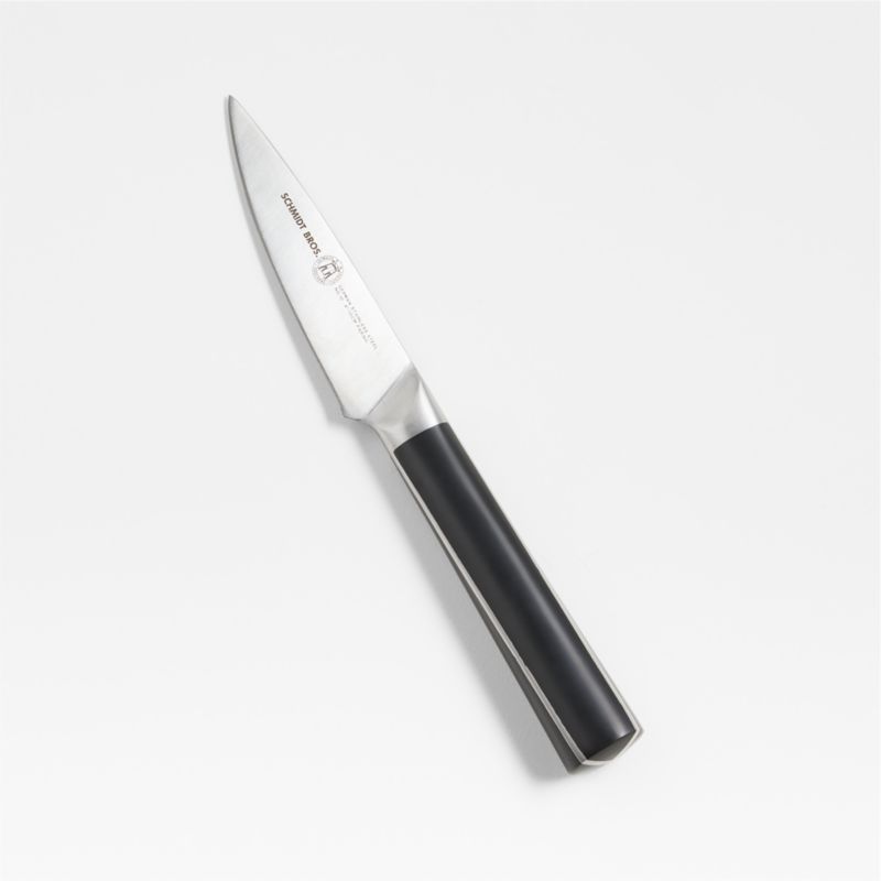 The ingenious Crosstown knife series from Schmidt Brothers utilizes two full tangs instead of one to distribute force evenly and reduce pressure needed to slice tough ingredients. The double-tang design also brings dynamic detail to this paring knife, finishing the black ergonomic handle with a sleek X of intersecting stainless steel. Ideal for coring, mincing and trimming, this ultra-sharp knife is an essential addition to your kitchen cutlery collection.
