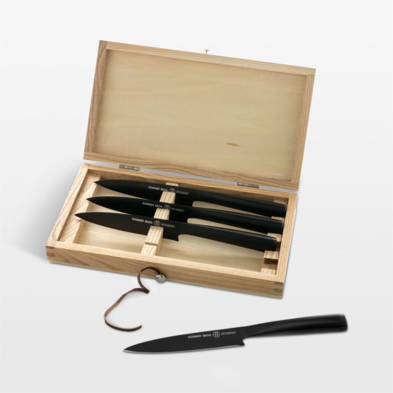 Finished in modern matte black, this set of steak knives brings edgy style to your dining table. Forged stainless steel holds an ultra-sharp edge for cutting meat without tearing. The four well-balanced and carefully weighted knives offer comfortable, ergonomic handles. Presented in a wooden storage box, our exclusive set makes a lovely host, housewarming or wedding gift.