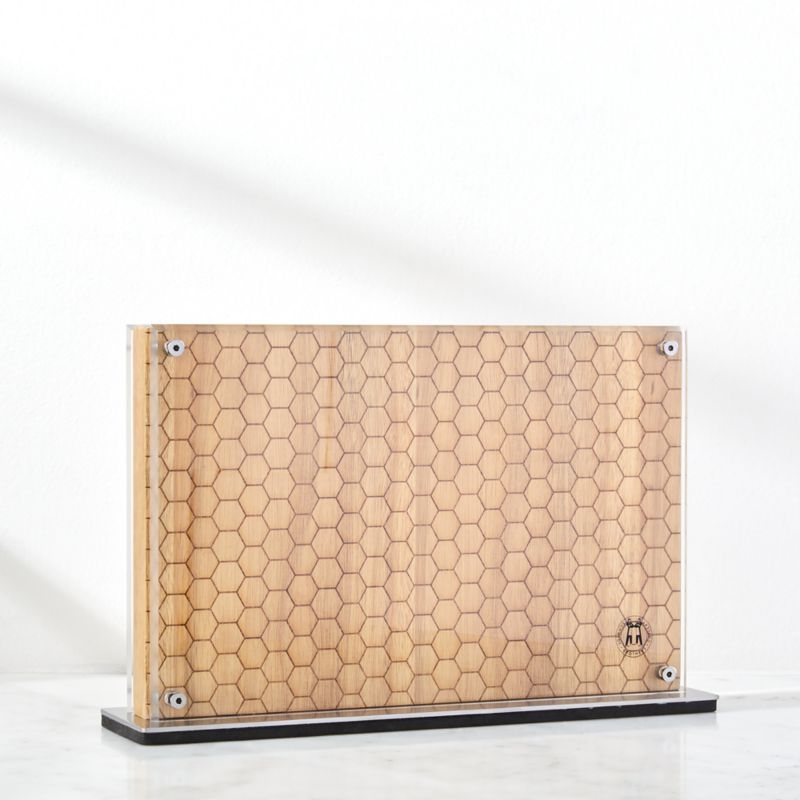 Improving upon knife storage with a simple yet style-conscious design, the New York-based Schmidt Brothers place magnets inside acacia wood sandwiched between acrylic panels. Patterned with graphic hexagons that come together to create a charming honeycomb, this slender knife block adds organic, geometric beauty to a kitchen countertop. Rising from its slim stainless steel base, the unique, space-saving design safely stores and displays up to 15 knives.