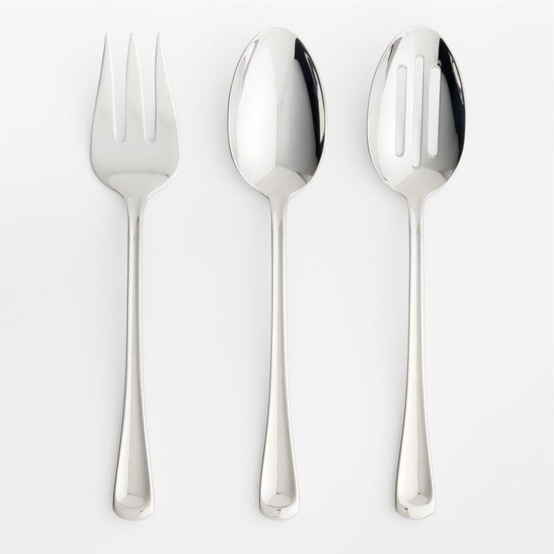 Appealing contours, subtly "scooped" handles and a sparkling mirror finish are suited to casual or formal dining.The three-piece stainless steel set includes a serving fork, serving spoon and slotted serving spoon. For a unified table, add our Scoop flatware and steak knives.