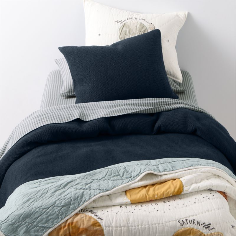 Here's the scoop on our waffle-weave bedding. In pure organic cotton that's gentle, soft, cozy and extra-durable, our Scoop waffle-weave duvet cover has a unique ability to always look clean, classic and crisp. In other words, it's an effortless way to keep a kid's bed looking bright and put-together. Reversing to smooth cotton, the cover offers 2 textural options in one perfect piece.