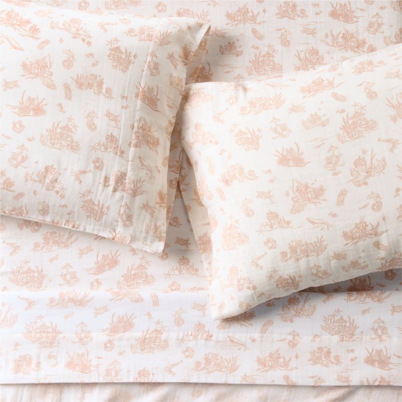 Our Seafield pink sheet set by designer Jake Arnold is a playful take on the historic toile pattern. Whimsical, sea-inspired details include an underwater carousel and an octopus toting an umbrella. It's all printed on our Supersoft organic cotton gauze, which is both breathable and cozy, thanks to a double-layer weaving technique that creates pockets of air to hold warmth. The sunwashed-pink hue has the same ease and mix-and-match versatility as the rest of the designer's seaside-inspired bedding collection.