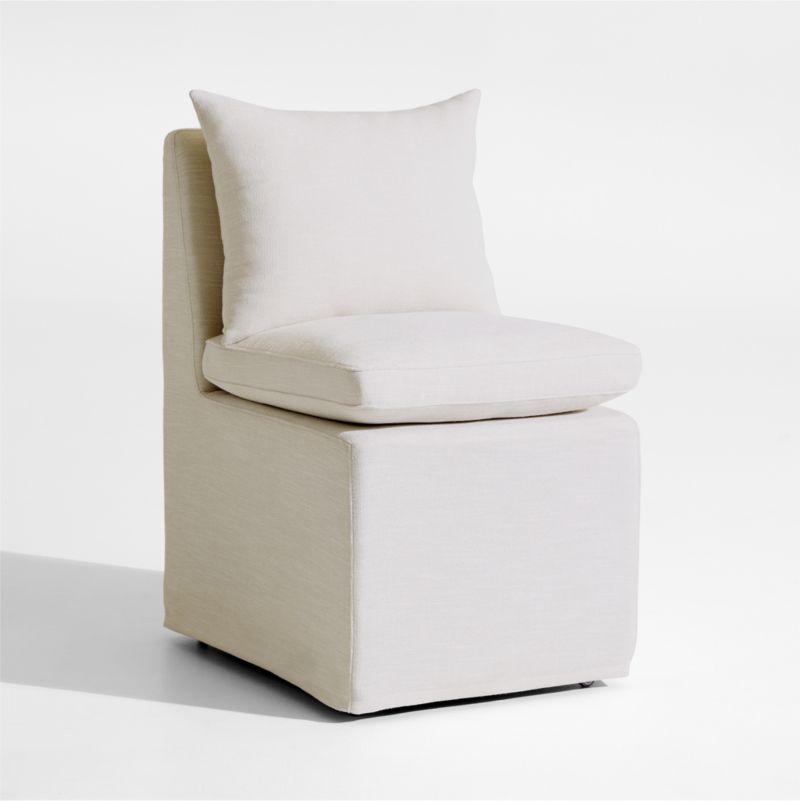 Our fully upholstered outdoor dining chair plays host to extra-plush, pillowy-soft seat and back cushions. Removable and machine washable, the crisp white slipcovers in a linen-textured fabric enhance the chair's casual attitude and beachy flair. The chair comes with two feet options—stationary for a classic look or casters for easy maneuvering.