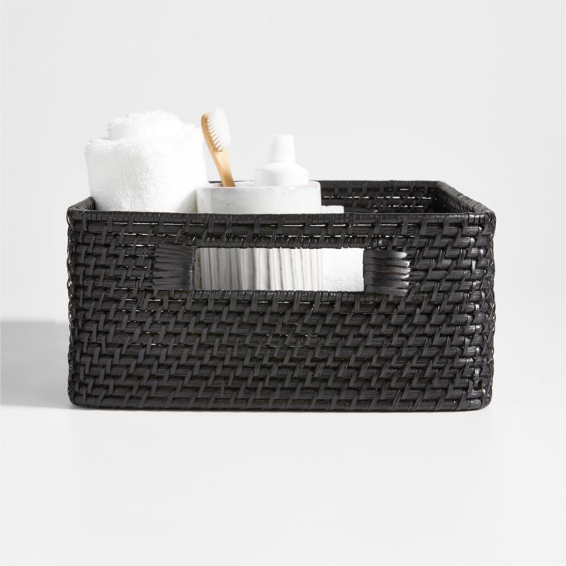 Handwoven of sturdy rattan and finished in chic black, our Sedona tote offers versatile storage with loads of texture. The rounded tote has cutout handles with wrap detail to store toiletries, books or supplies in the bath, bedroom or office. Complete the look with other black accessories in our exclusive Sedona collection. Due to its handcrafted nature, each one will be slightly unique.