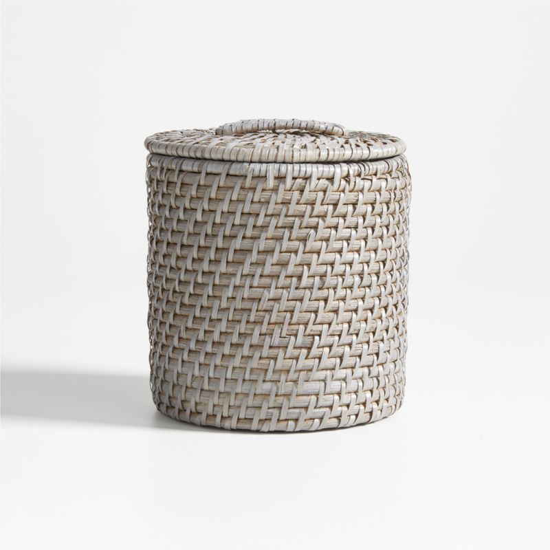 Designed with clean lines, this small catch-all canister brings lively texture and artisan craftsmanship to bath, office or bedroom storage. Handwoven of natural rattan and split buri fiber with a smart grey finish, the round container has a slim lid with a nearly flush handle for a modern look. Pair our exclusive small canister with its larger counterpart for even more storage options.