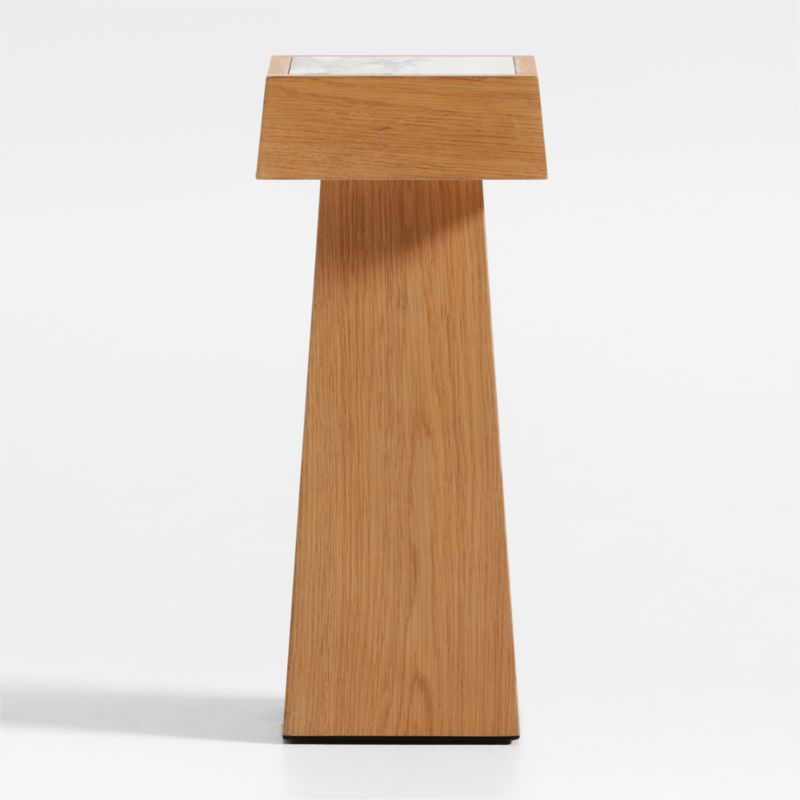 A dramatic shape and seamless mix of materials lend major style to the space-saving scale of our Seriana end table. A tapered pedestal base and thick angled top make a monolithic statement, while the inset slab of arabescato marble enchants with cool grey tones and hints of gold that vary with each unique piece. Made of white oak and white oak veneer, the table is lightly wirebrushed to bring out the grain and warmed with a light brown finish. Despite its grand presence, the petite drink table is sized to fit perfectly next to an armchair.