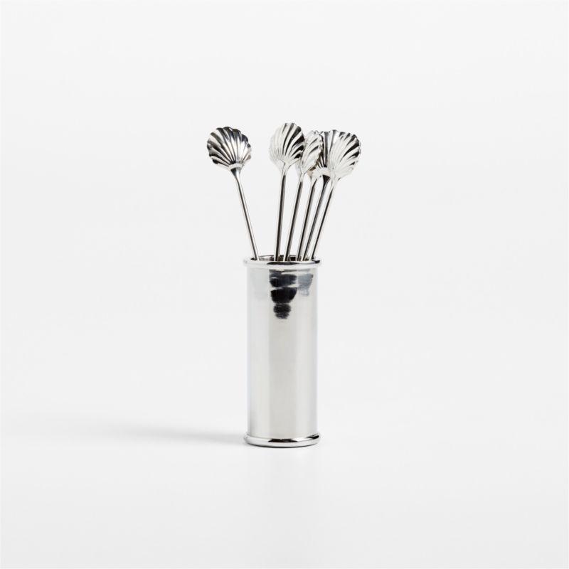 Romeo barware elevates every sip and snack with vintage-inspired elegance. Put a charming finishing touch on your favorite cocktails with these stainless steel picks. Each topped with a mini scallop shell, the six picks in the set skewer lemon rinds, olives and other cocktail garnishes. A cylindrical pick holder completes the collection—the two-ounce container is conveniently sized to do double duty as a shot glass.
