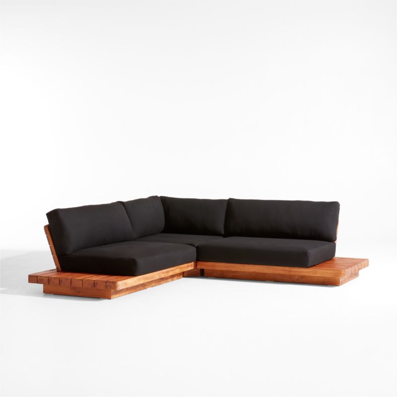 Our Runwell outdoor lounge collection sets the stage for sun-dappled afternoons and warm summer nights. Dynamic and contemporary, the teak sectional props plush cushions on a recessed platform base with angled backs. Covered in black weather-resistant fabric, the cushions have a canvas-like hand feel and sit extra deep and comfy. Joined by a corner, the right- and left-hand sofas extend their platforms slightly beyond the cushions to create resting spots for drinks or snack plates.