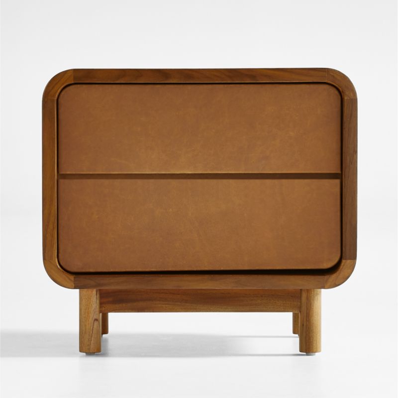Timeless with a nod to modern, our Shinola Runwell nightstand impresses with a leather facade ensconced in a rounded walnut veneer frame. The nightstand's two stacked drawers are wrapped in top-grain leather with a stunning matte surface. Simply rub out scuffs and marks with your hand and watch as the leather develops its own rich patina over time. Walnut veneer embraces the drawers with rounded contours and beautiful woodgrain. Look for the contrasting color and grain in the finger joints on the nightstand's corners. Short round legs give the nightstand a bit of a lift.