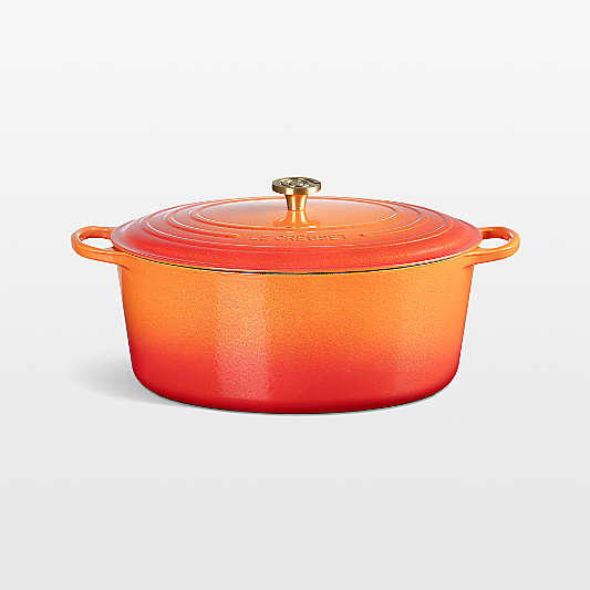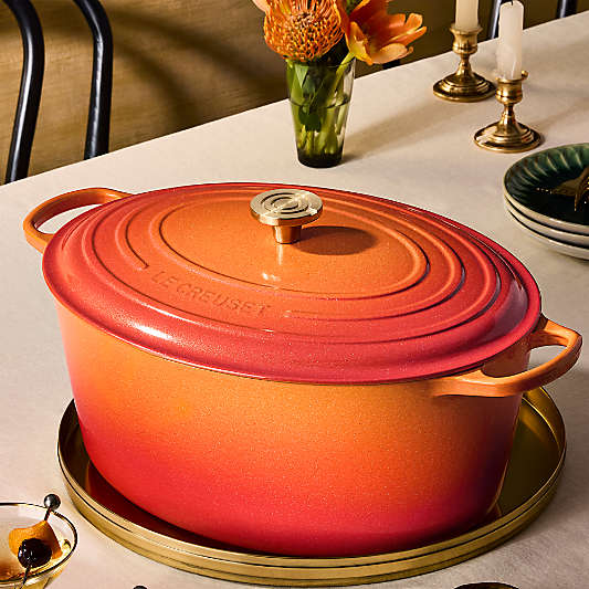 Le Creuset Dutch ovens come in two primary shapes: round and oval. While this difference may not seem especially notable, it does influence the types of food the pot can accommodate, so think about how you see yourself using it and for which recipes. A Le Creuset round Dutch oven, for example, is most compatible with soups, stews and one-pot meals cooked on the stovetop, as the circular shape mimics the shape of the burner so that all ingredients are heated evenly. Looking to use your Le Creuset Dutch oven in the conventional oven? With its oblong shape, a Le Creuset oval Dutch oven is best for roasting large cuts of meat, such as roasts, whole chickens or turkeys. Whether you opt for a round or oval Le Creuset oven, the brand's artisanal looks make for elegant stove- or oven-to- table serveware; make sure to place a coordinating trivet underneath to protect your tabletop.