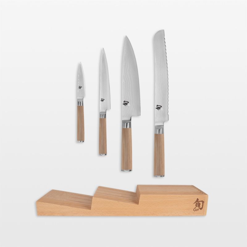 This versatile knife set ably handles meats, vegetables and breads with ease. Crafted by hand with over 100 steps, the blades boast 34 layers of stainless steel forged on each side of razor-sharp cores. The resulting rippled Damascus finish provides durability while keeping the knives lightweight and maneuverable. Ergonomic blond-tinted handles provide a comfortable grip in either hand. Accommodating the 3.5-inch paring, 6-inch utility, 8-inch chef's and 9-inch bread knives with room to spare, the low-profile beechwood tray takes cutlery off the counter and stows it neatly in a drawer.