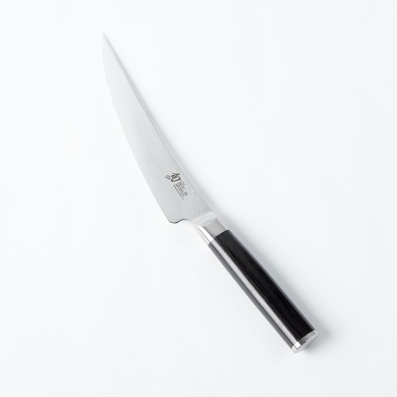 Bone, fillet and trim with this handcrafted knife. The gracefully curved and extremely sharp blade separates meat from bone, trims silver skin and slices cutlets with ease. Created by highly skilled artisans in Japan, this boning knife pairs a steel blade with a D-shaped PakkaWood ® handle of resin-impregnated birch. The sleek ebony-hued handle contrasts intriguingly with the blade's flowing layers of Damascus stainless steel cladding for a fillet knife stunning in looks and performance.