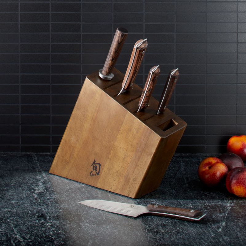 Kanso knives embody a design principle based on Zen philosophy. Meaning "simplicity," the Kanso collection focuses on the essentials that make a knife superior. Featuring razor-sharp blades of high-carbon stainless steel, Kanso knives are constructed with a full tang for balance and precise cutting control. Contoured handles are made of tagayasan wood, the same material used for samurai sword handles. Like all Shun knives, Kanso is sharpened to 16 degrees on each side. Set includes 3.5" paring, 5.5" hollow-ground santoku, 6" utility and 8" chef's knives, and honing steel. Solid wood block has three additional slots for knife and kitchen shear storage.