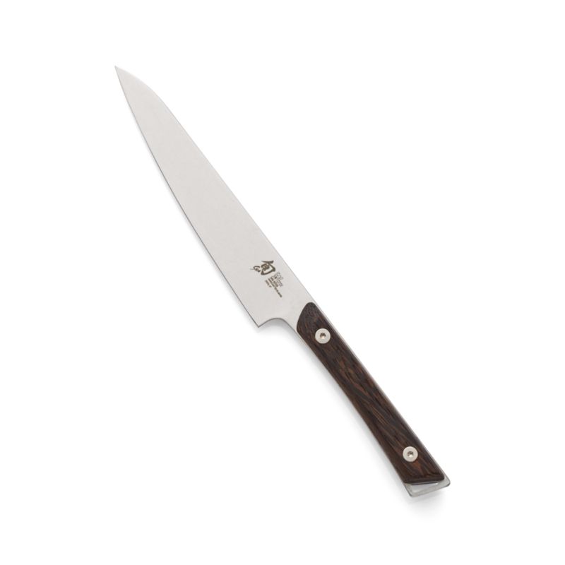 Kanso knives embody a design principle based on Zen philosophy. Meaning "simplicity," the Kanso collection focuses on the essentials that make a knife superior. Featuring razor-sharp blades of high-carbon stainless steel, Kanso knives are constructed with a full tang for balance and precise cutting control. Contoured handles are made of tagayasan wood, the same material used for samurai sword handles. Like all Shun knives, Kanso is sharpened to 16 degrees on each side. A cross between a chef's knife and paring knife, the utility knife is more narrow and straight. It is the perfect for small tasks where precise cuts are needed, such as trimming broccoli, green beans, or smaller veggies.