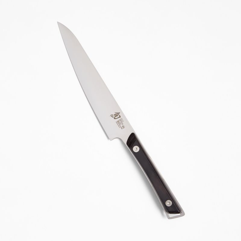 Skilled artisans craft the Kazahana utility knife by hand, honing the narrow blade to an exceedingly sharp and long-lasting edge. The high-carbon stainless steel is then polished by hand to create a satin finish that reduces drag while cutting and releases food easily. A subtle curve allows moderate rocking cuts as well as precise trimming tasks. Beautifully balanced and strong, the versatile knife is finished with a double-riveted handle polished to a glossy ebony finish.