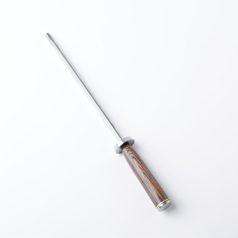 Treat your knives well. This honing steel's built-in angle guide takes the guesswork out of sharpening. Designed to gently realign cutting edges, the two honing surfaces—smooth for everyday use, micro-ribbed for weekly care—maintain prized knives beautifully. The walnut-hued PakkaWood ® handle contrasts beautifully with the stainless steel rod while providing a comfortable grip. This combination honing steel is the perfect tool for keeping your Shun Premier knives in top condition.
