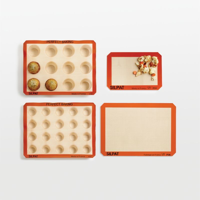 Bake without greasing pans with butter, oil or spray. Made with food-grade silicone and reinforced fiberglass mesh, the two mats and two muffin molds in the set cook evenly and release baked foods without effort. To use, place a mat or muffin mold on a baking pan or cookie sheet, top or fill with dough, batter or frozen foods, and bake. Oven-safe to 500°F, the cookware cleans up easily in the dishwasher.