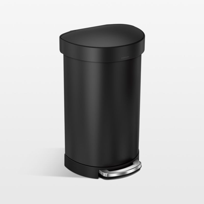 Designed for smaller spots, this space-saving, semi-round trash can fits neatly against a wall. The matte black stainless steel can features an innovative easy-lift liner rim that grips the liner to keep unsightly edges concealed. The strong steel step pedal is engineered to last with patented lid shox technology to ensure a smooth, silent close every time.
