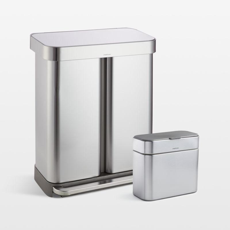 This handsome set handles trash, recyclables and compost in sleek style. Constructed of stainless steel with soft-closing lids, the slim compost caddy and two-compartment trash can/recycler sort household waste efficiently. The caddy stands on the counter to hold organic scraps as you prep or attaches magnetically to the can. Thoughtfully constructed to conceal liner bags, the compost bucket and trash can/recycling bin keep your kitchen or pantry looking clean and modern.