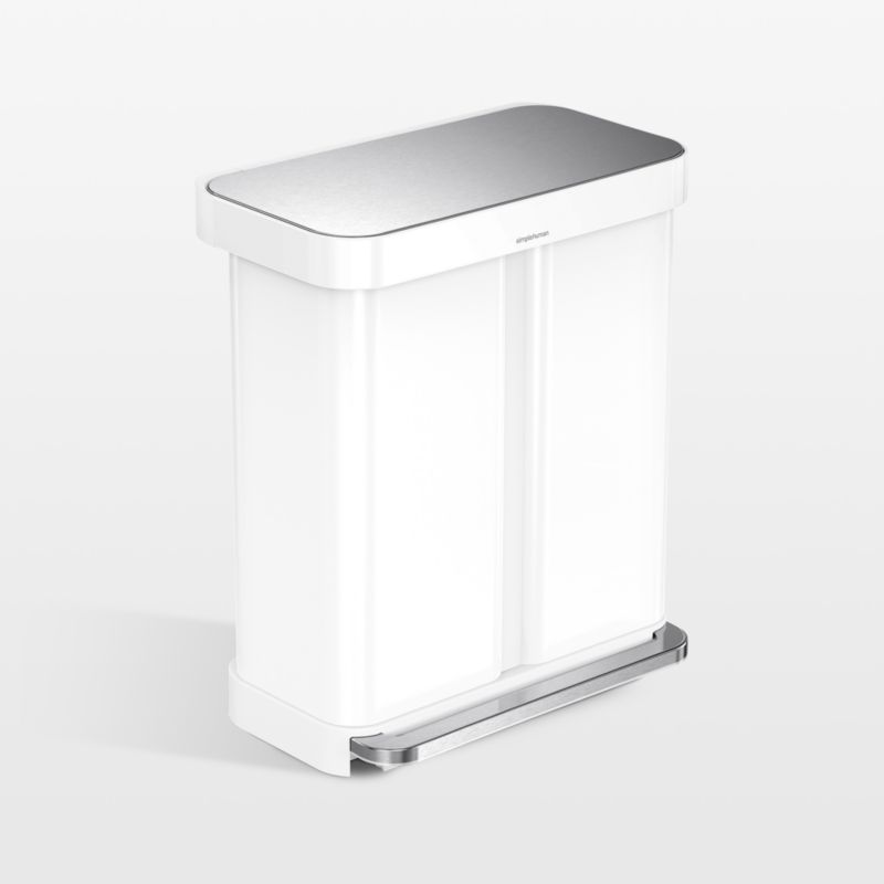 This handsome recycler separates trash from recyclables with efficiency and style. Inside its slim-lined, white-finished steel exterior is a dual bucket design with a built-in liner dispenser that stores bags right where you need them. A liner rim flips up when it's time to change liners and closes over the new liner, keeping it in place and hidden from view. The step can design features an extra-wide steel pedal that's engineered to last 150,000 steps—20 steps a day for 20 years. The recycler's patented lid technology controls the motion of the lid for a slow, silent close.