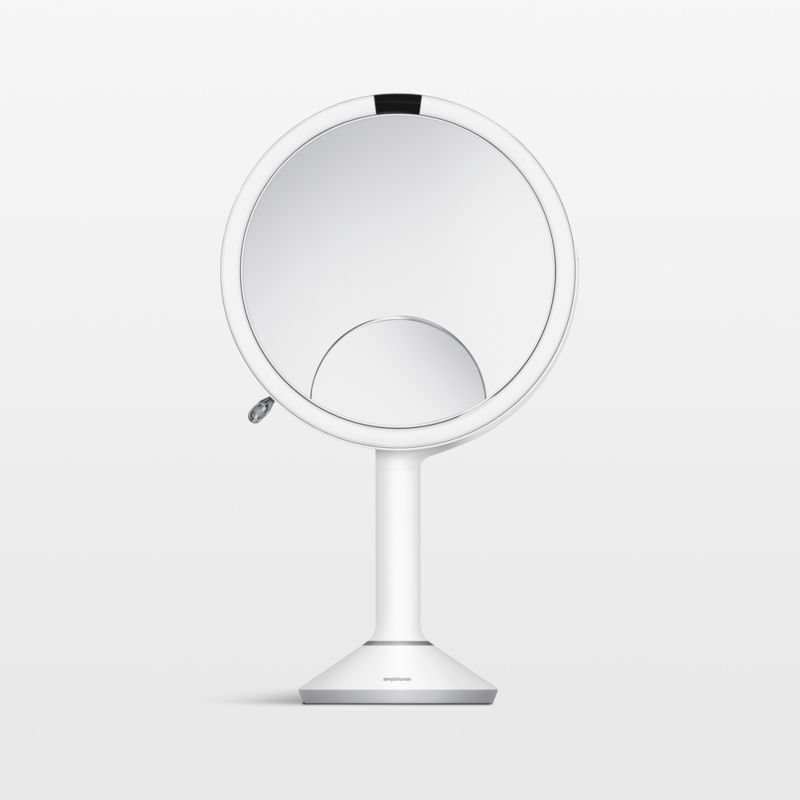 One mirror, three magnification levels. One side offers a standard view with a ten-fold magnifying window, or flip the mirror over for a reflection that's magnified five times. Elevated on a geometric white stand, the sleek mirror flips easily between views. A ring of long-lasting LEDs surrounds the mirror, illuminating with natural sunlight or candlelight light settings. Micro-reflectors diffuse the full-color spectrum light evenly, and the motion-sensor light turns on automatically. Control the brightness level with just a touch, and charge the mirror with a standard USB for up to five weeks flawless reflections.