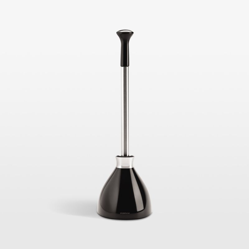 This uniquely designed toilet plunger unclogs toilets with a minimalist design that fits in with any decor. The plunger flange has a long and narrow profile designed to work more efficiently with modern toilets. A magnetic collar on the caddy secures the plunger's sturdy stainless steel handle, concealing the brush and allowing plunger and cover to be carried together without drips.