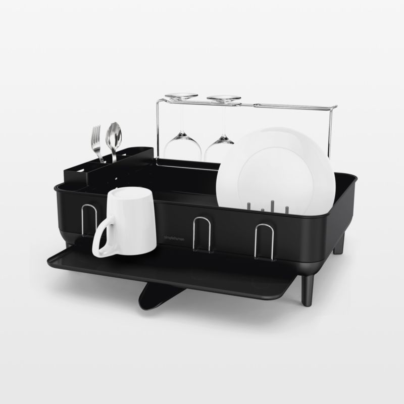 Crafted of matte black stainless steel to coordinate with your appliances, this fingerprint-proof dish rack dries dinnerware, flatware and up to four extra-large wine glasses in clean, modern style. The silicone-capped wire rack holds dishes firmly in place without scratching, and rubber feet keep the rack right where you want it. Finished with a coating that prevents buildup and water spots, the inner plastic tray dries quickly, while the draining spout rotates 360 degrees to suit your kitchen setup.