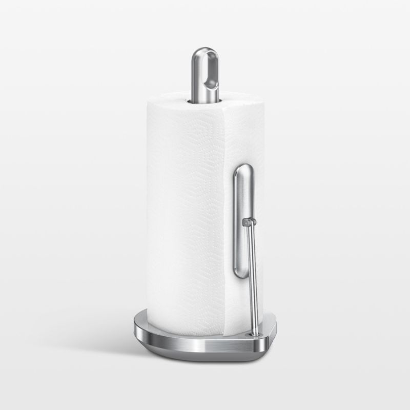 This paper towel holder makes kitchen cleanup a little bit easier. Accommodating a single roll of paper towels, the holder's tension arm lets you tear one or more paper towels with just one hand. A weighted base keeps the holder securely in place, while a finger loop makes it easy to tote the holder to and fro. Made of durable stainless steel, the paper towel holder has a decor-friendly brushed finish.