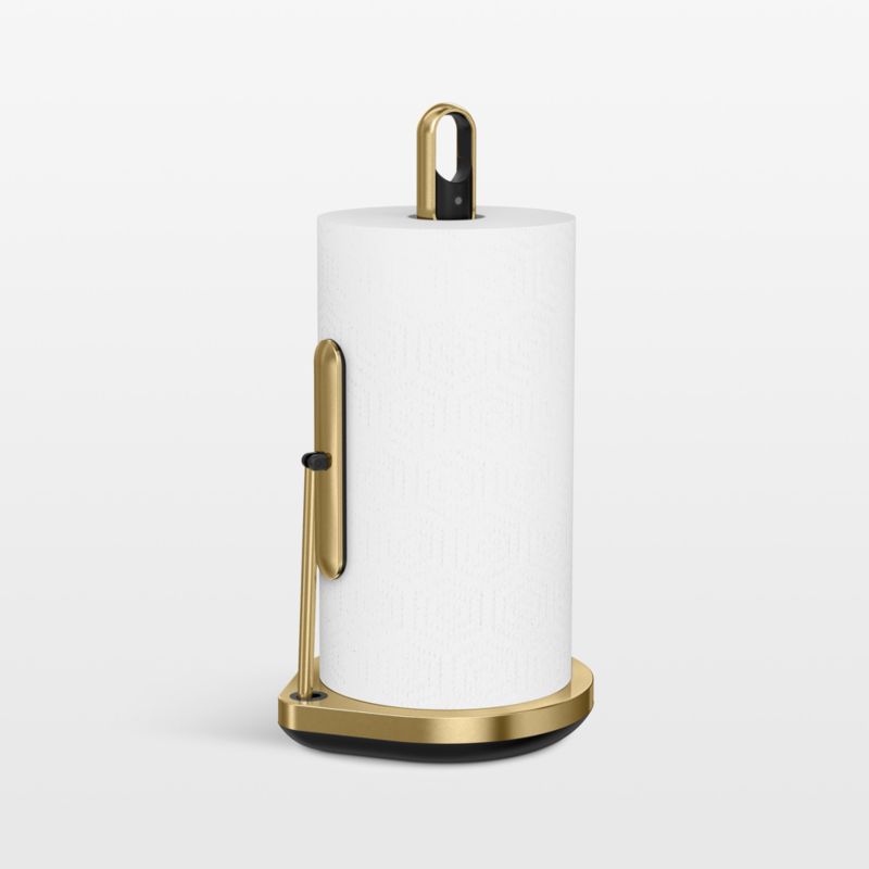 This all-in-one paper towel holder and spray pump makes kitchen cleanup a little bit easier. Accommodating a single roll of paper towels, the holder's tension arm lets you tear one or more paper towels with just one hand. The rod doubles as a spray bottle, cleverly concealing a pump trigger and reservoir for cleaning solution. A single push releases the sprayer from the base. A weighted base keeps the holder securely in place, while a finger loop makes it easy to tote the holder to and fro. Made of durable steel, the paper towel holder has a decor-friendly brass finish.