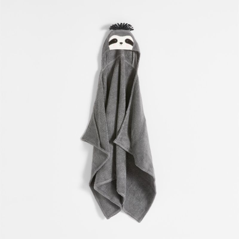 Slow things down after bath time with our sleepy sloth hooded towel. Made from 100% organic cotton ribbed terry, it's soft, absorbent and cozy against little ones' skin. The hood features an appliquéd sloth face with rosy cheeks and a soft charcoal hue. Add a name or monogram to make it an easy favorite for post-bath routines.