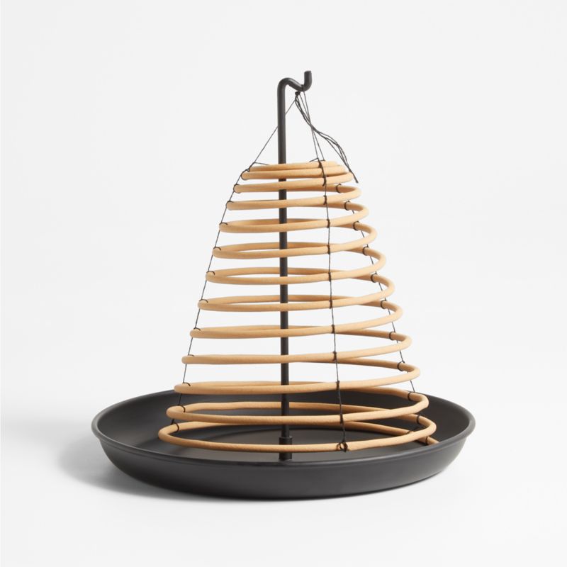 Waft a fresh, citrusy scent over your porch, patio or picnic table with this small citronella coil. The compressed wood burns slowly for up to 36 hours, releasing the fragrances of essential oils as it smolders. Hung from our black metal holder, the citronella coil evokes a modern reimagining of a charming bee skep.