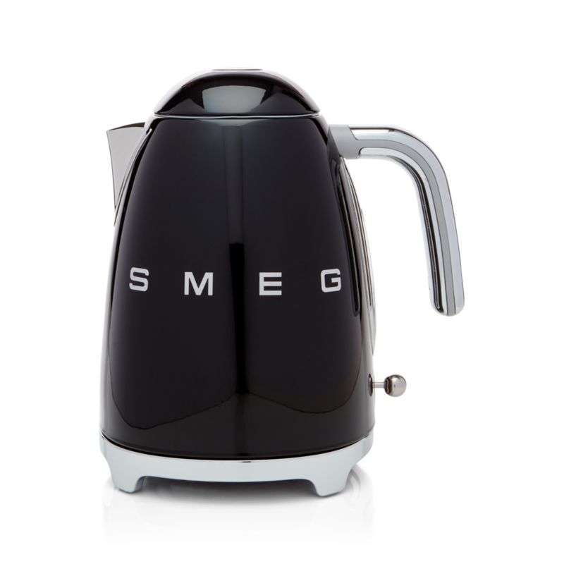 This SMEG kettle in a shiny black has a charming bullet shape and fun chrome metal accents. The electric kettle goes beyond basics with a soft-opening lid to manage steam release and a swivel base that rotates full circle. The stainless steel kettle heats water quickly for tea, pour-over or French press coffee and tisanes.