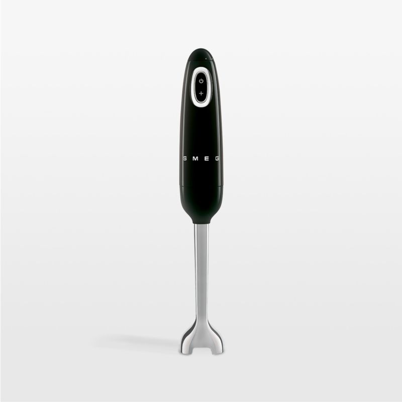 This glossy black hand blender offers modern functionality with a hint of retro-futuristic style. Five speeds plus a turbo function ensure total control over the blended texture, whether you're making chunky chowder, rustic applesauce or silky ganache. Stainless steel blades make short work of ingredients while the immersion blender's ergonomic handle provides a comfortable hold. The blending arm twists off for easy cleaning and compact storage.
