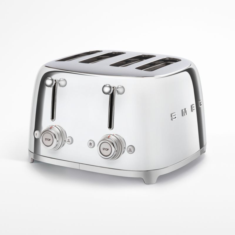 Finished in polished chrome and accented with a charming ball lever knob, this retro four-slice toaster browns bread, bagels and more at six levels with three convenient pre-set programs. Two control panels ensure everyone's toast is done to their specifications. Four extra-wide slots accommodate different slice widths, and self-centering racks ensure even toasting.