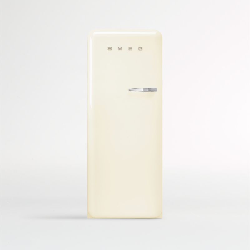 Inspired by classic mid-century appliances, the SMEG refrigerator brings a charming retro design to the contemporary kitchen. The delightfully throwback refrigerator features rounded corners, a cream exterior and chrome accents. Inside, the modern-minded appliance opens to a compact inner freezer compartment and a flexible interior with adjustable glass shelves, produce drawers and multiple in-door bins. Designed to make efficient use of kitchen space, the freestanding refrigerator looks great at any angle with a sleek single door that opens to the left to accommodate your kitchen layout.
