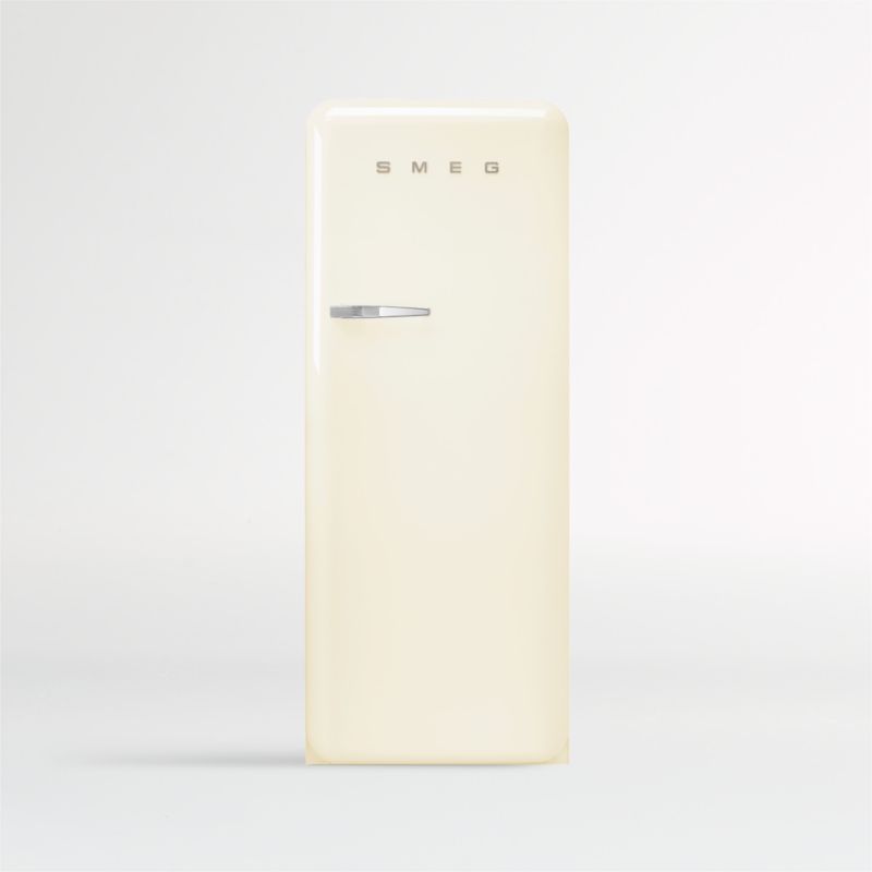 Inspired by classic mid-century appliances, the SMEG refrigerator brings a charming retro design to the contemporary kitchen. The delightfully throwback refrigerator features rounded corners, a cream exterior and chrome accents. Inside, the modern-minded appliance opens to a compact inner freezer compartment and a flexible interior with adjustable glass shelves, produce drawers and multiple in-door bins. Designed to make efficient use of kitchen space, the freestanding refrigerator looks great at any angle with a sleek single door that opens to the right to accommodate your kitchen layout.