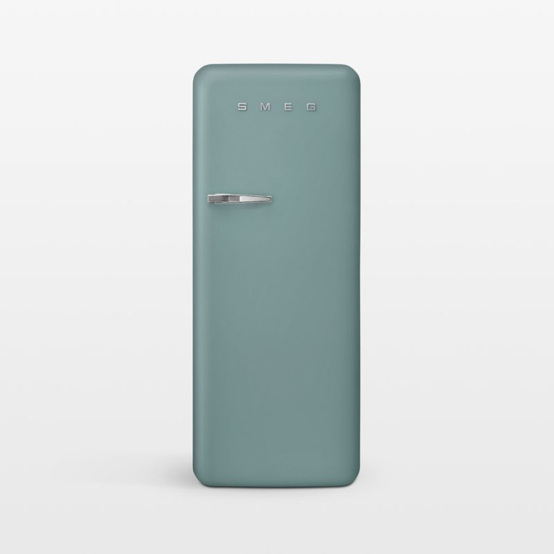 Inspired by classic mid-century appliances, the SMEG refrigerator brings a charming retro design to the contemporary kitchen. The delightfully throwback refrigerator features rounded corners, a matte jade exterior and chrome accents. Inside, the modern-minded appliance opens to a compact inner freezer compartment and a flexible interior with adjustable glass shelves, produce drawers and multiple in-door bins. Designed to make efficient use of kitchen space, the freestanding refrigerator looks great at any angle with a sleek single door that opens to the right to accommodate your kitchen layout.