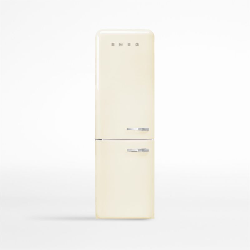 Inspired by classic mid-century appliances, the SMEG refrigerator brings a charming retro design to the contemporary kitchen. The delightfully throwback refrigerator features rounded corners, a glossy cream-colored exterior and chrome accents. Inside, the refrigerator door opens two adjustable glass shelves, three adjustable in-door bins and produce drawer and cooler drawers with sliding glass covers. The bottom freezer is frost free and features three drawers. Designed to make efficient use of kitchen space, the freestanding refrigerator looks great at any angle with doors that open to the right to accommodate your kitchen layout.