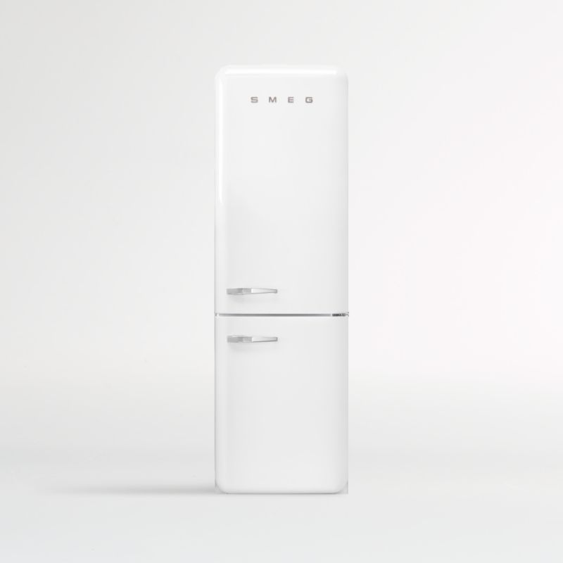 Inspired by classic mid-century appliances, the SMEG refrigerator brings a charming retro design to the contemporary kitchen. The delightfully throwback refrigerator features rounded corners, a glossy white exterior and chrome accents. Inside, the refrigerator door opens to two adjustable glass shelves, three adjustable in-door bins and produce drawer and cooler drawers with sliding glass covers. The bottom freezer is frost free and features three drawers. Designed to make efficient use of kitchen space, the freestanding refrigerator looks great at any angle with doors that open to the right to accommodate your kitchen layout.