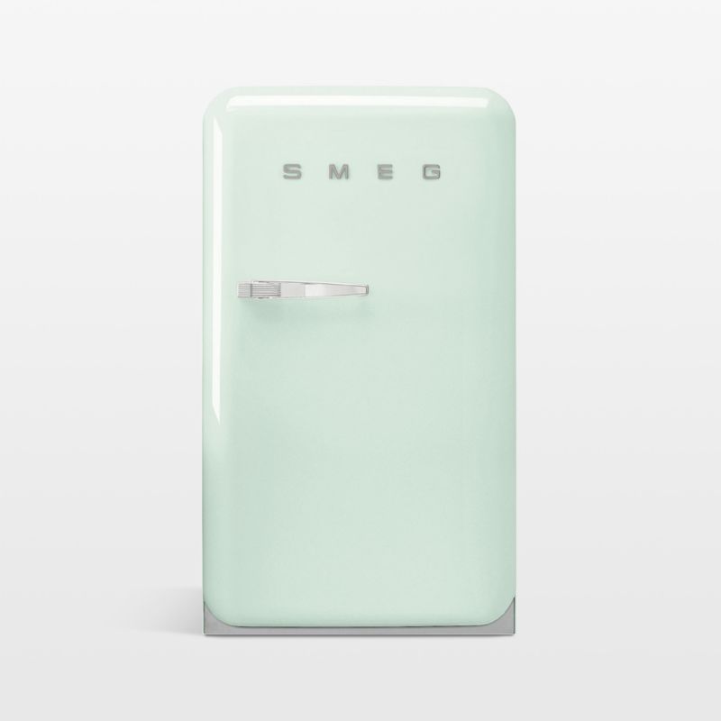 Inspired by classic mid-century appliances, SMEG refrigerators bring retro charm to the contemporary kitchen. This petite fridge features rounded corners, a glossy pastel green exterior and chrome accents for an impeccable throwback look. The modern-minded FAB10 opens to a flexible interior with adjustable glass shelves, crisper drawer and compact inner freezer compartment. A bottle shelf and two adjustable shelves on the door add organized storage. Designed to make efficient use of limited space, the freestanding refrigerator looks great at any angle with a sleek single door that opens to the right to accommodate your floor plan.