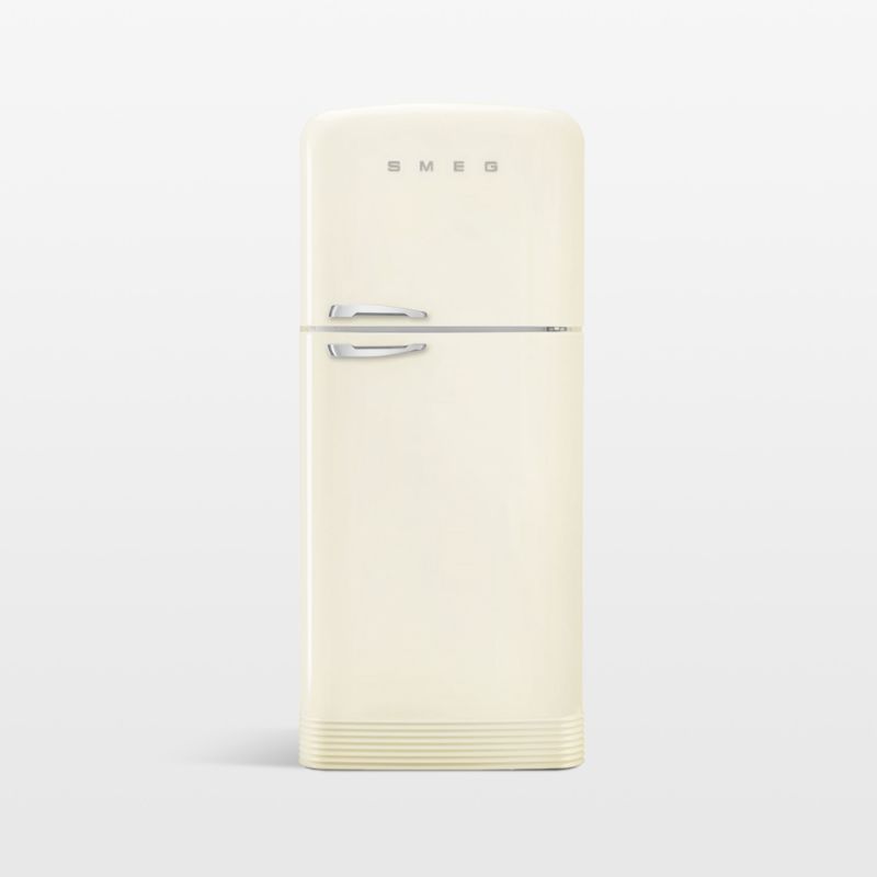 Inspired by classic mid-century appliances, SMEG refrigerators bring retro charm to the contemporary kitchen. The double-door fridge features rounded corners, a glossy cream exterior and chrome accents for a throwback look. The modern-minded FAB50 opens to a LED-lit interior with adjustable glass shelves and a fruit/vegetable storage drawer and a crisper cover. The door features three adjustable shelves and a bottle shelf. The freezer compartment is cooled with a no-frost dual-flow system that automatically defrosts and includes an automatic ice maker and fast-freeze compartment.
