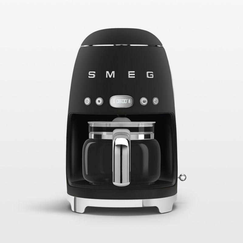 Styled with charming bullet shape and fun chrome metal accents, this matte black drip coffee maker delivers up to 10 cups of delicious coffee. Adjustable for aroma levels from light to intense, the machine can be programmed for brew time, and the keep-warm function maintains a hot temperature for up to an hour after brewing.