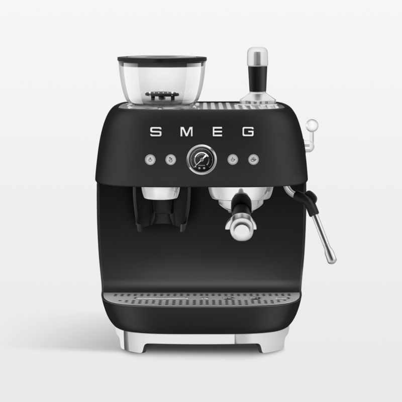 Retro style meets modern tech in our exclusive semi-automatic espresso maker from SMEG. With its charming curves, matte black finish and stainless steel accents, this machine brings charming style and delicious espresso to your kitchen. Add your favorite beans to the adjustable conical burr grinder, choose one or two shots, then grind and brew. Enjoy your espresso as is or use the instant steam function to froth milk to perfection.